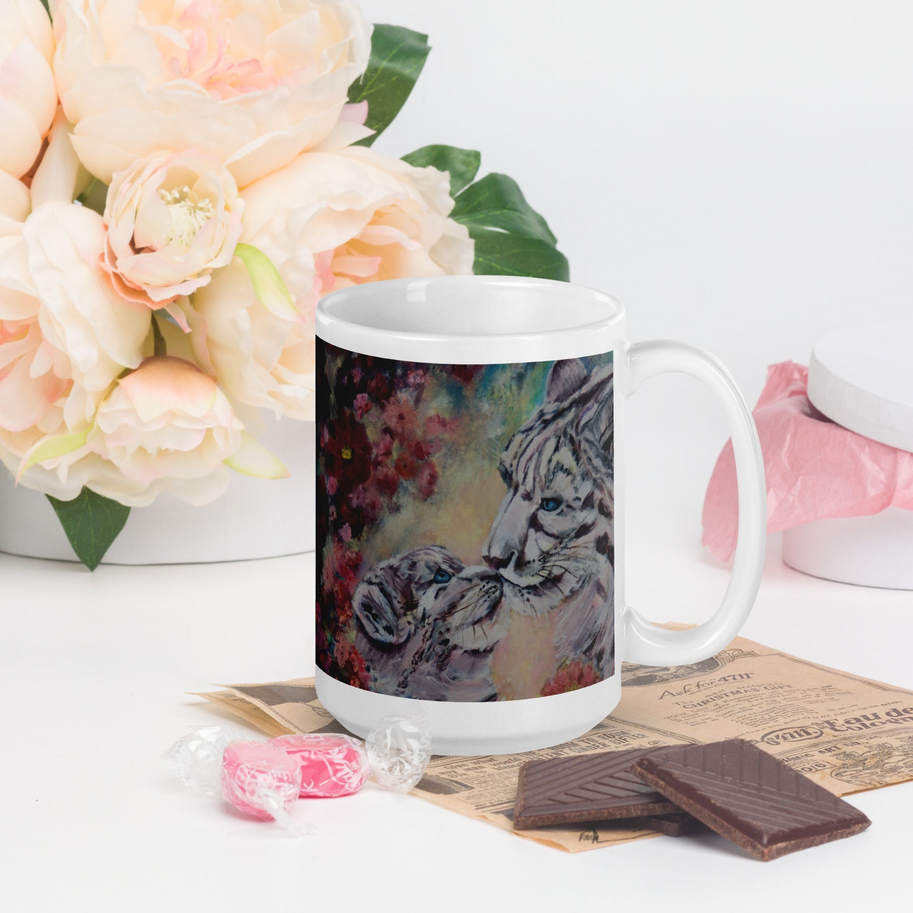 Surrounded by flowers, both painted and real carefully dried from a garden, the warmth this mother and cub feel for each other is evident. “A Good Morning Kiss” reminds us daily the importance of affection even in the wild kingdom.