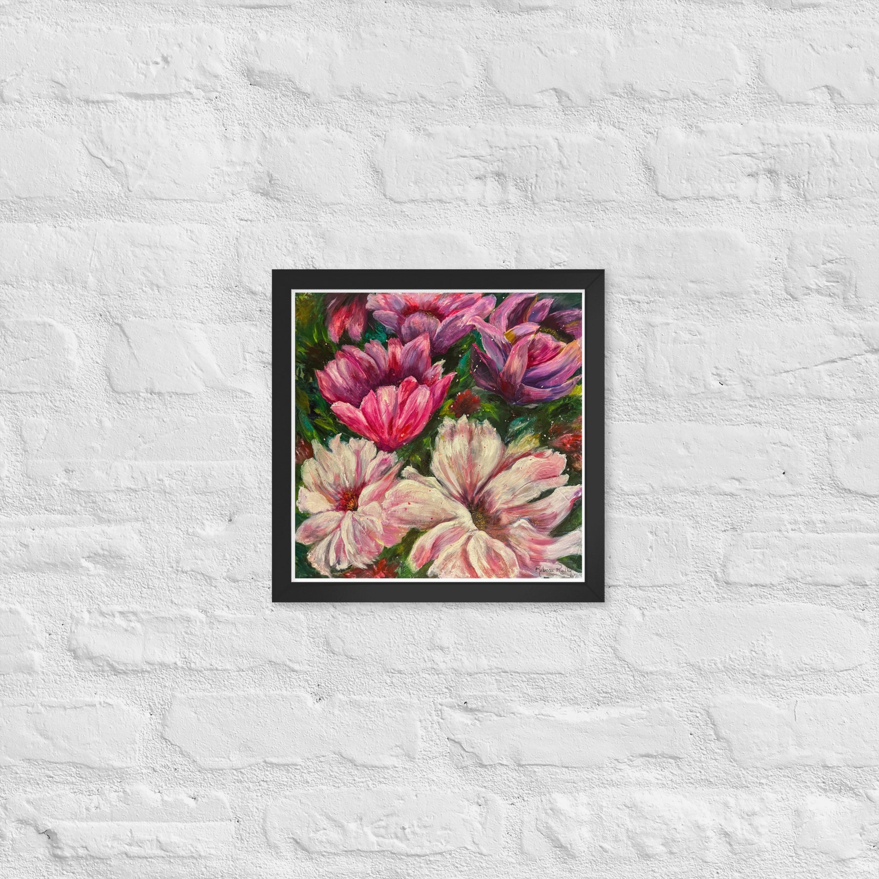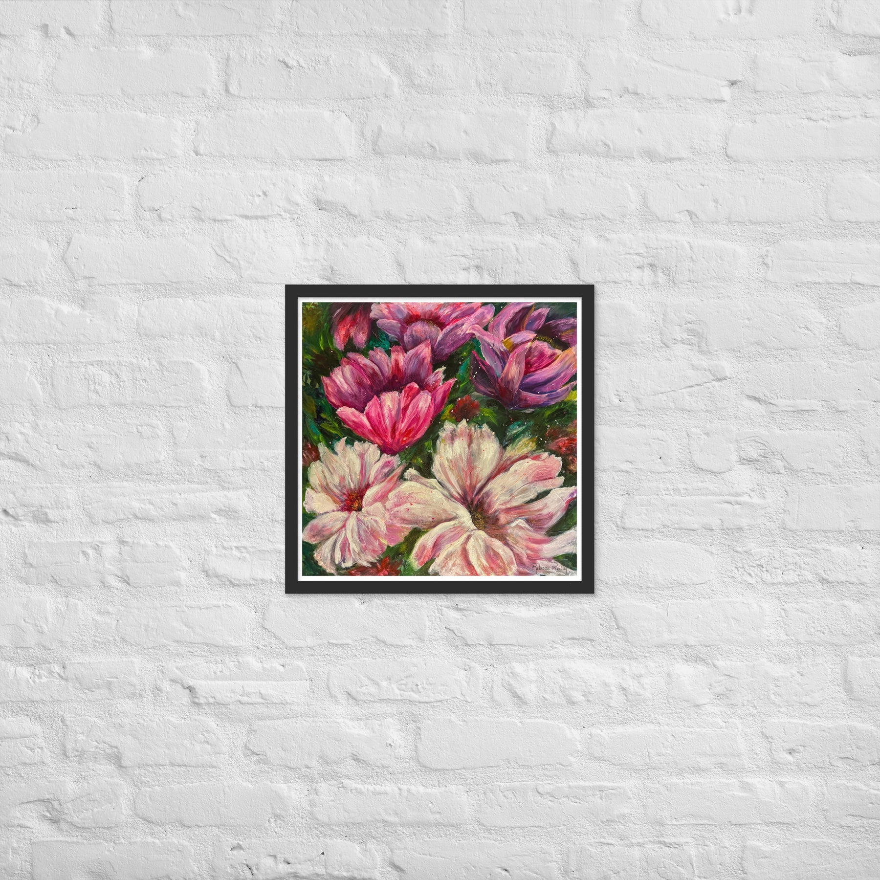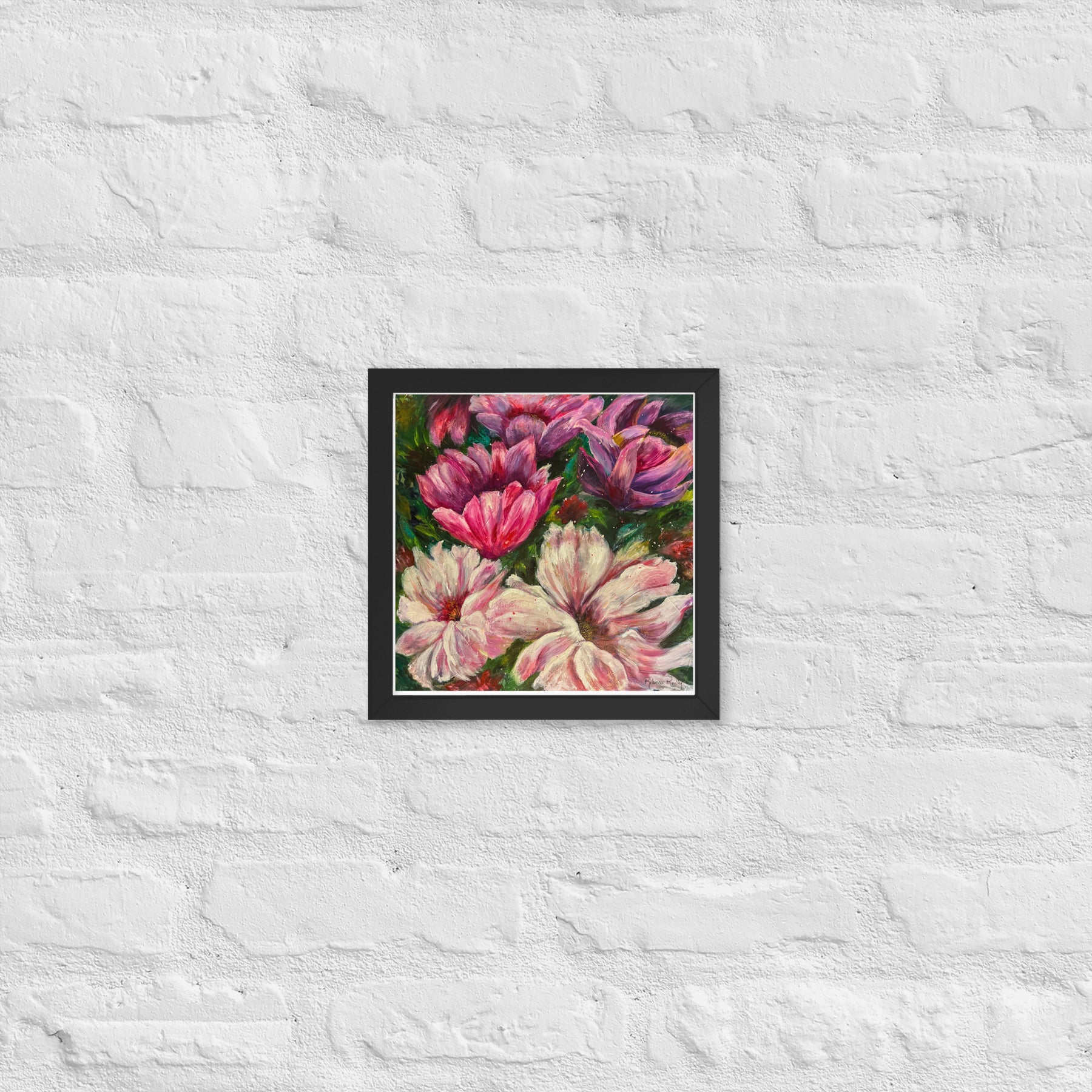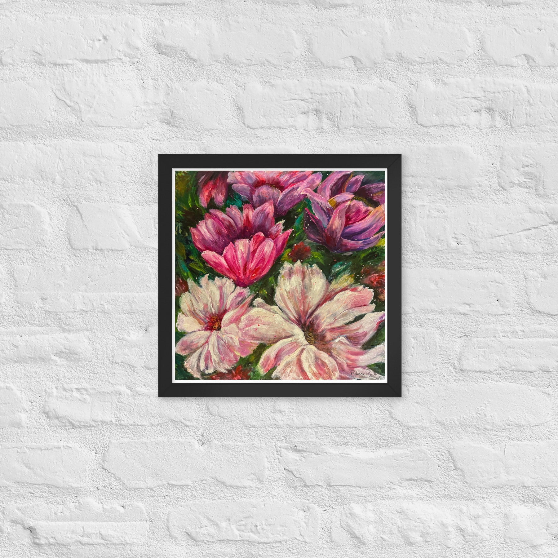 "Flourish" is a vivid, expressive floral composition done in oil. It features large, bold flowers in rich pink, magenta, purple, and soft white tones. The petals are layered and textured, with visible brushstrokes giving a sense of depth and movement. The flowers seem to almost burst off the canvas, radiating energy and life.